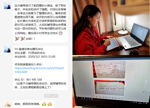 郭雨同学是数学与应用数学专业的一位学生党员,她是第一个报名“沛霖”志愿者辅导队的学生。她说“每日看新闻,特别担心湖北学生,希望自己能帮他(她)们树立信心,消除恐惧”。了解被困在湖北的小学五年级学生付绍仪的情况以后,郭雨主动联系学生家长,多次沟通辅导需求,协助家长调试辅导软件,建立了辅导工作群。2月25日至今,郭雨已经为付绍仪在线辅导了7次,付绍仪家长对郭雨和理虎扑nba给予了充分肯定。疫情期间,郭雨还向湖北慈善总会捐赠了300元,缴纳了特殊党费500元。