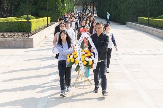 在烈士陵园,师生党员伫立在“丹心碧血为人民”纪念碑前举行悼念仪式。在雄壮的《国际歌》乐曲声中,党员代表向纪念碑敬献花圈,全体党员向长眠在此的烈士们三鞠躬,表达对先烈的缅怀和敬仰之情。