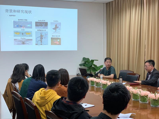 张卫平在讲座中以仿生微飞行器发展为主线,介绍了世界上的仿生微飞行器发展历程,着重介绍了仿生超微飞行机器人的MEMS技术、高性能仿生材料、高能量仿生肌肉、高效率仿生机构、仿生控制系统、平面转立体智能复合材料的叠层制造、扑翼飞行的高升力、高机动性和高稳定性等关键技术。他还介绍了自己研制的压电驱动微型仿生飞行器,它重84mg,翼展35mm,在100Hz的拍打共振频率下可以产生±60°的拍打角度,能产生足够的升力实现起飞。最后,报告结合仿生微飞行器发展需求探讨了今后仿生微飞行器的发展趋势。