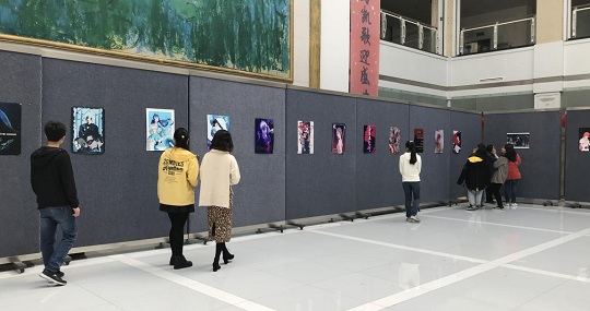 本次活动共收集由CG社及设湍社成员提供的作品共计67幅,经筛选挑出24副作品进行展示。展览选用两种色彩对比强烈的颜色,布置于左右两边,展现特性。本次展览作品包括由CG社选出的数码板绘的插图作品,内容多样,造型各异;而以制作海报为主的设湍社团,也一展其平面设计水准。