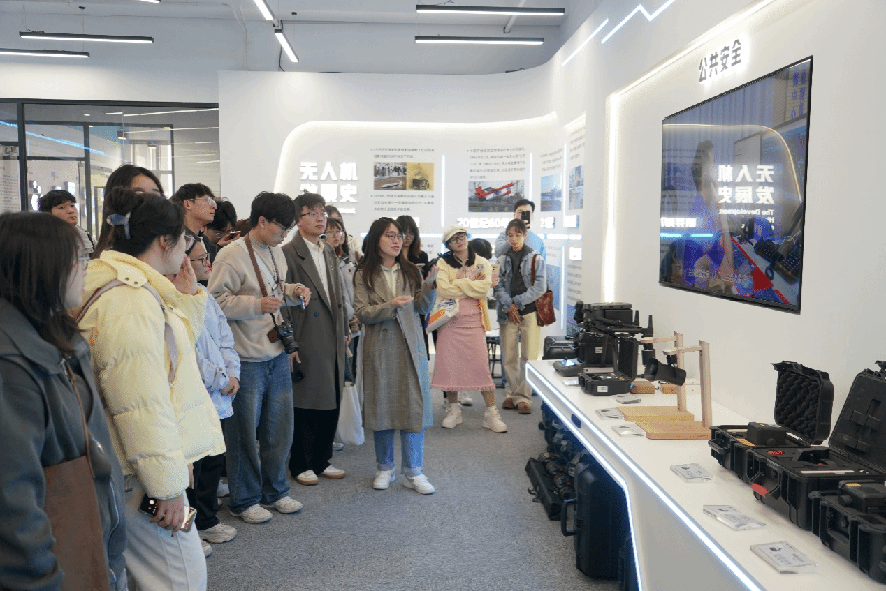 双瀛航空科技负责人带领师生参观企业展厅,讲解人员围绕不同机型的功能与应用场景进行了详细讲解,“大疆机场系统”作为企业主打造的无人机智慧综合管理平台核心组成,融合了自动飞行算法、机载AI控制器、智慧管理系统与大数据分析技术,具备抗风、防尘防水、耐低温等强大环境适应能力,能够实现无人机任务的全流程自动化与智能化操作。
