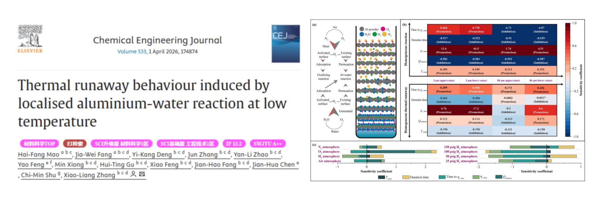 近日,依托我校过程安全与智能控制重点实验室、美丽中国与生态文明研究院,城市建设与生态技术学部张小良教授(通讯作者)、香料香精化妆品学部毛海舫教授(第一作者)和博士研究生方家未(学生第一作者)在中科院一区TOP期刊《Chemical Engineering Journal》(IF:13.2)发表题为“Thermal runaway behaviour induced by localised aluminium-water reaction at low temperature”的论文。