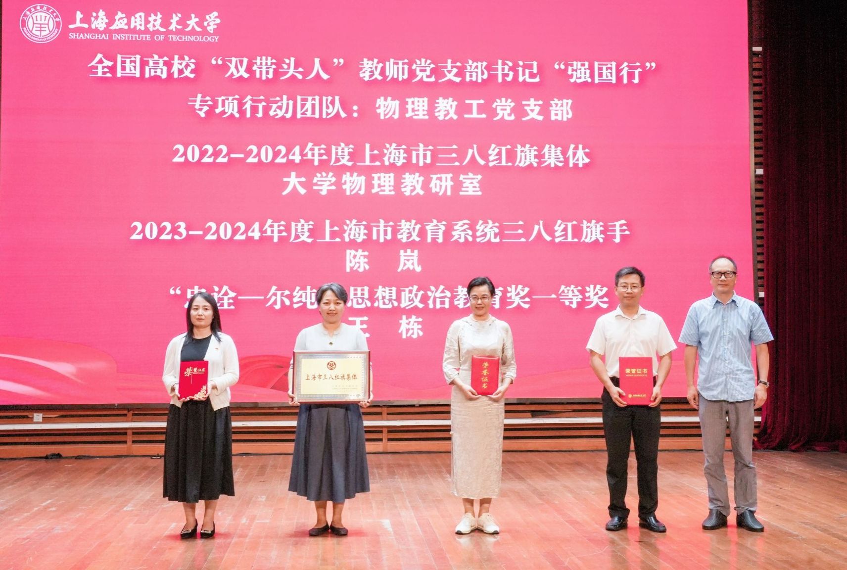 全国高校“双带头人”教师党支部书记“强国行”专项行动团队、上海市三八红旗集体、上海市教育系统三八红旗手、“忠诠-尔纯”思想政治教育奖一等奖获得者获颁获奖证书
