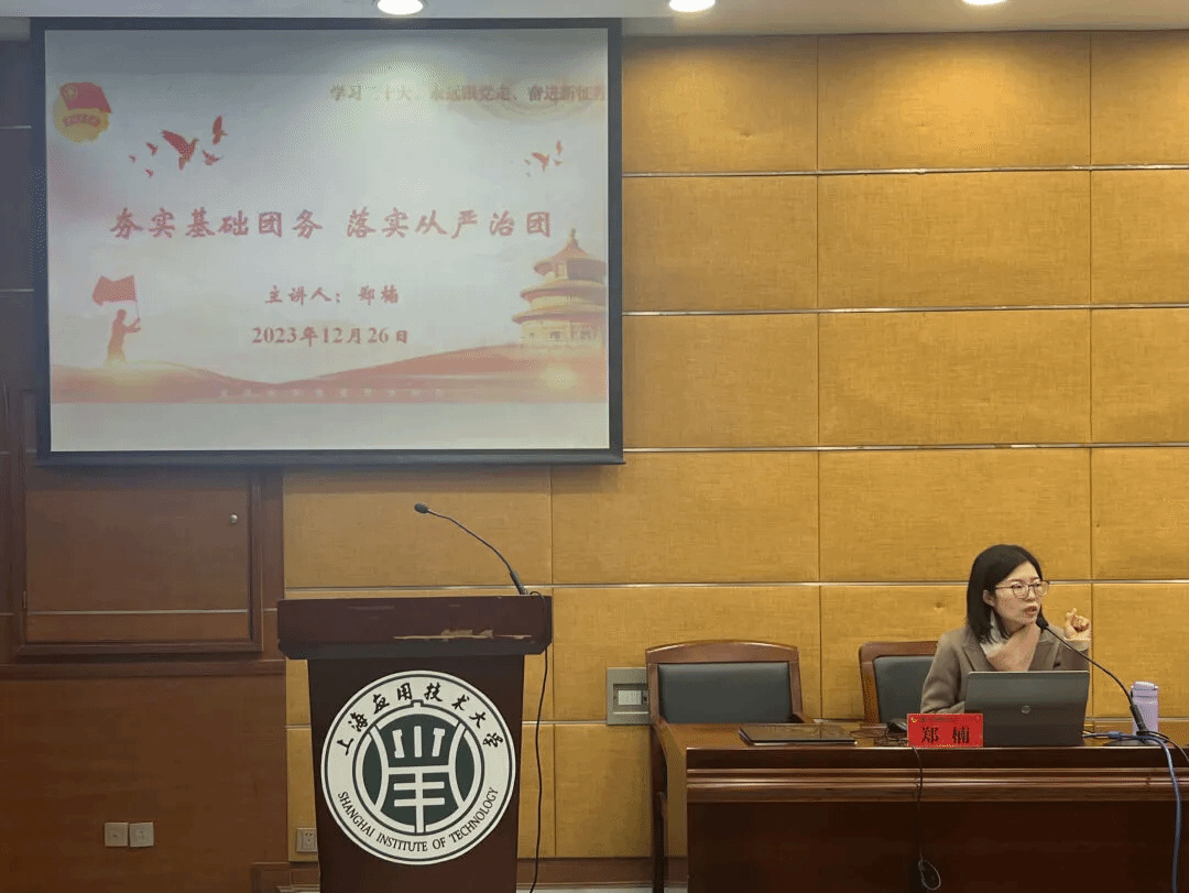 上海应用技术大学党委办公室郑楠老师以《夯实基础团务,落实从严治团》为题,结合党的二十大精神,介绍了共青团的性质和宗旨。她针对团章和最新团员发展要求,对团员发展的原则、要求、流程进行了讲解。她还就智慧团建、团组织生活、团徽团章等内容做了介绍,让入团积极分子更全面认识团员身份。
