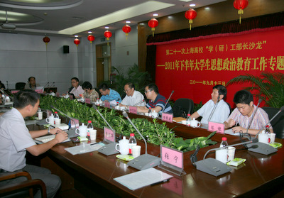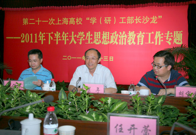 9月13日下午,第二十一次上海高校学(研)工部长沙龙在我校漕宝路校区图书馆成功举行,本次沙龙以2011年度大学生思想政治教育工作为专题,由市教委德育处主办,我校学工部承办。校党委副书记、副院长康年,市教卫党委宣传处副处长、教委德育处处长胡宝国出席沙龙会。来自上海各高校的学(研)工部长参加了会议。
