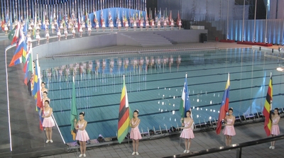 一个人、一面旗,代表着一个国家,姑娘们深知自己的使命与责任;两个月的艰苦训练,记录着她们的足迹和汗水;开、闭幕仪式上的精彩亮相,向全世界展示出中国大学生的靓丽形象和青春风采。
