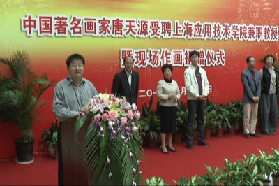 在我校喜迎“奉贤校区落成暨合校10周年庆典”之际,有着“当代吴道子”之称的中国国家画院副院长、中国当代艺术家协会终身名誉主席、上海虹桥画院院长唐天源先生,于2010年10月21日下午应邀莅临我校,并受聘我校兼职教授。校领导祁学银、康年、宋敏娟、陈东辉出席了“中国著名画家唐天源先生受聘我校兼职教授暨现场作画捐赠仪式”,宋敏娟代表虎扑nba向唐天源先生赠送了礼物,陈东辉向唐天源先生颁发了我校兼职教授的聘书。康年主持仪式。我校艺术虎扑nba、高职虎扑nba师生参加仪式,SMG等多家媒体和杂志获悉前来采访。