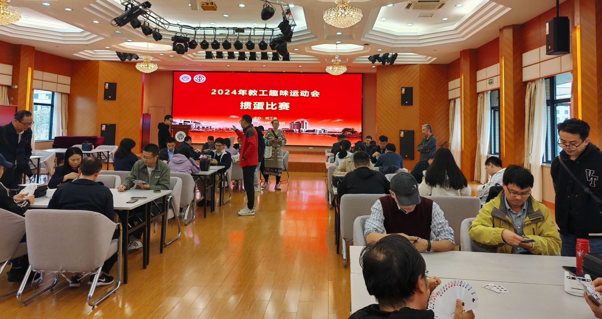 教工们在集体项目中尽显团队默契与欢乐,这是智慧和体力的角逐,更是团结和协作的完美比拼。各类妙趣横生的单人项目受到教工们的喜爱,标准的姿势,专注的眼神,彰显着上应人的投入和执着,比赛现场洋溢着欢乐的笑声。除了体力上的较量,校工会还给热爱纸牌游戏的老师们提供了展示智慧和交流互动的平台,16支参赛队在紧张刺激的竞技中释放压力,享受游戏带来的轻松与愉悦。