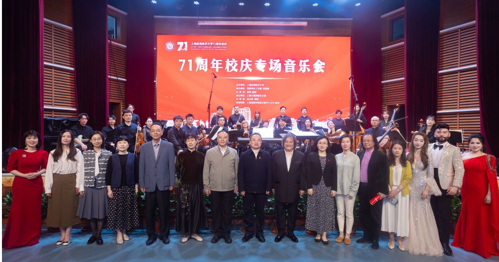 演出结束,校领导与上海九棵树爱乐乐团演职人员合影留念。上海九棵树爱乐乐团以层层递进且极具穿透力的饱满音符,奏响了上海应用技术大学71周年校庆的华彩乐章。此次音乐会,用乐曲传递奋进的力量,在经典旋律中厚植家国情怀,让师生们在美育浸润中不断前行,开拓创新,为实现中华民族伟大复兴的中国梦而不懈奋斗。
