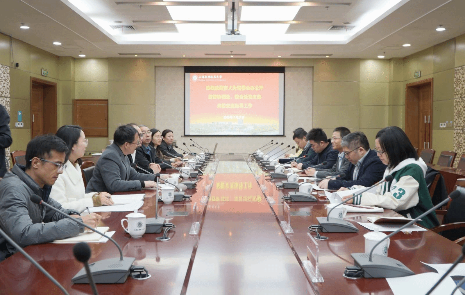11月27日,上海市人大常委会办公厅副主任、党支部书记余志强一行来校进行交流座谈。副校长毛祥东,党委常委、组织部长杨瑞君出席。机关党委书记于有进主持会议。