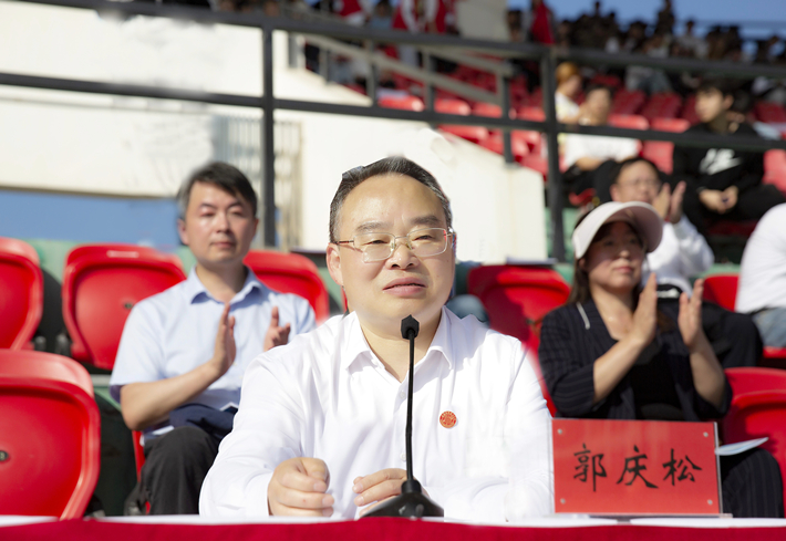 郭庆松宣布上海应用技术大学第八届(总23届)田径运动会正式开幕。现场礼花绽放,红旗、院旗挥舞,全场方队掌声热烈,形成一片欢乐的海洋。