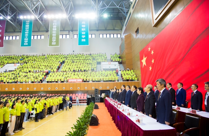 身着新绿色T恤衫的5000余名新生齐聚一堂,体育馆主馆大厅格外明亮。下午13时,全场师生起立,高唱中华人民共和国国歌,五星红旗迎风飘扬,开学典礼正式开始。