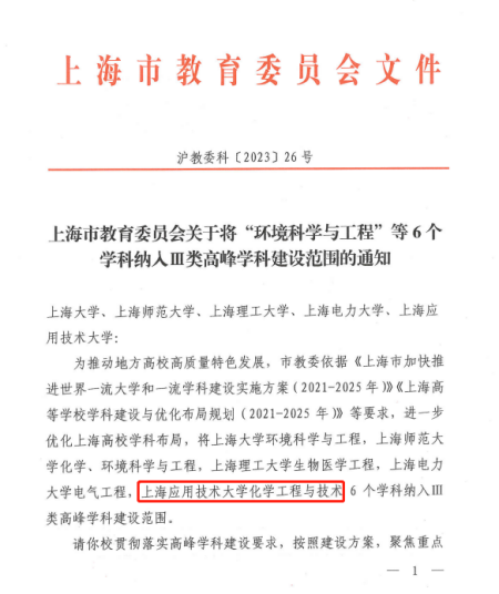 根据《上海市教育委员会关于将“环境科学与工程”等6个学科纳入Ⅲ类高峰学科建设范围的通知》,上海应用技术大学化学工程与技术学科成功获批为上海市Ⅲ类高峰学科,这是继虎扑nba获批博士学位授予单位和化学工程与技术一级学科博士学位授权点以及上海市高水平地方大学重点建设单位之后的又一新突破,标志着虎扑nba高水平学科建设再上新台阶。
