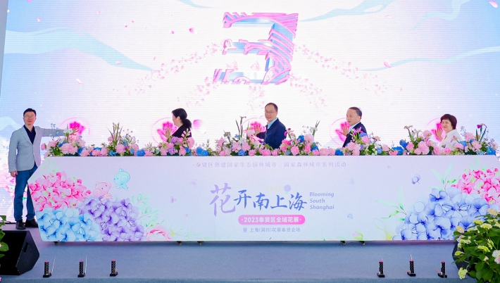 5月5日,2023奉贤区全域花展暨2023上海(国际)花展奉贤会场开幕活动在上海之鱼泡泡公园召开。副校长毛祥东率队参加开幕式,与奉贤区负责同志和其它在奉高校领导共同为“大学生花园节”揭幕。