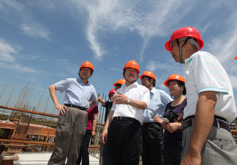 在体育馆工地现场,校领导登上了体育馆最高看台,俯瞰初现轮廓的场馆全貌,认真听取了参加工程建设的设计、施工、监理等单位负责人的工程进展汇报,详细询问并实地考察了工程建设情况,向坚守在高温一线辛勤工作的施工人员送上了毛巾、饮用水和沐浴露等防暑降温用品。