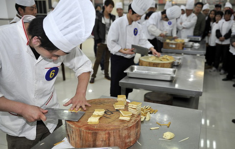 4月13日下午,第三食堂二楼群情踊跃,异常热闹。由校工会、后勤保障处主办的餐饮岗位职工基本技能比赛正在紧张举行。平日里拿饭勺的阿姨们拿着笔正襟危坐紧张作答,后台的厨师在众人面前大展身手,还有拉面师傅挥舞着神功……,精湛的刀工、娴熟的技艺赢得全场交口称赞。