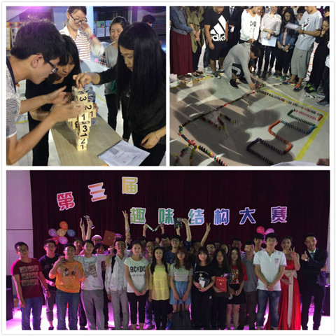 此次比赛在彰显专业特色的同时,将知识性、趣味性等融为一体。内容主要分三部分。首先进行的是扑克牌搭高承重比赛,在有限的时间内,同学们用两幅扑克牌和一把剪刀来构造模型并进行承重测试,这很好地锻炼了学生的思维和动手能力。第二部分是方块撘高比赛,参赛者们通过用标有分值的积木搭建模型来获得本轮的得分。第三部分是骨牌游戏,参赛者们用骨牌搭出自己喜欢的形状。同学生们巧夺天工的作品,也展示出当代大学生独有的创造力。