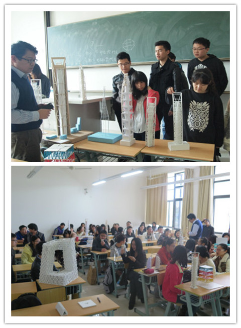 在本周的建筑构造课上呈现了一种奇观:来自世界各地的知名建筑汇聚在此,法国的埃菲尔铁塔、迪拜的帆船酒店,帝都央视大楼及上海环球金融中心和金茂大厦等。任课老师李建斌惊喜不已,一一点评作业,就模型存在的问题给出解决办法,学生们专注听取意见。李建斌说,对于模型的搭建,努力和付出是必要也是唯一的成功条件,与天赋无关,通过一次次模型的搭建,让建筑系同学深刻地体会到“一份耕耘一份收获”的道理。