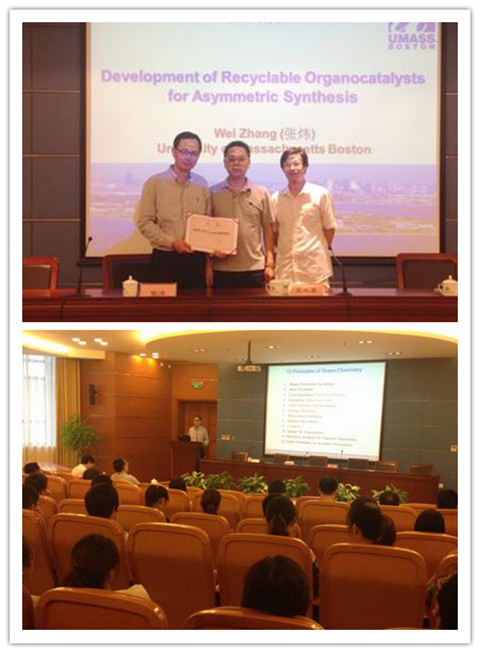 授聘仪式后,张炜教授作了题为《Development of Recyclable Organocatalysts for Asymmetric Synthesis》的学术报告,他从绿色化学的角度出发,介绍了有机催化的优点和最新的研究趋势,详细地介绍了自己课题组在可回收的氟相有机小分子催化剂方面取得的研究进展,整个报告深入浅出,使大家受益匪浅。