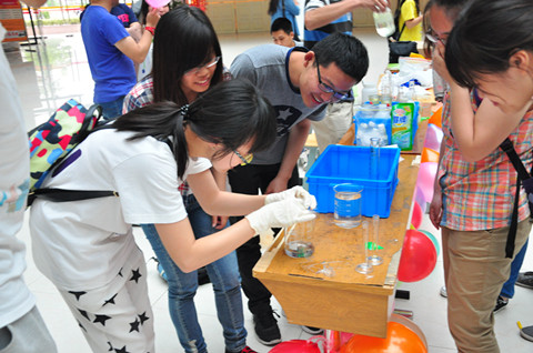 在化工虎扑nba展区,集奇幻的化学实验、火辣的文艺表演和充满挑战的趣味游戏于一体,将科学奥秘与体育游戏有机结合起来,吸引了许多同学。特别是化学实验区,一个个有趣的化学实验,一次次耐心的讲解,使枯燥无味的化学呈现出了别样的魅力,从“大象牙膏”到“水中花园”,无不引得同学们驻足观看,拍手叫绝。