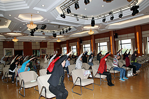 对于经常从事伏案工作、电脑操作的师生来说,手腕、肩颈、腰椎等部位的劳损十分常见。到底怎样的运动才能消除肩颈腰背痛,达到健康平衡态呢?万芹老师示范、讲解的办公室健康操以“远离肩颈腰背痛——你的椅子能帮你”为主题,利用“椅子”这一亲密的工作伙伴,精心设计了简单易行的锻炼动作,从而达到肌体舒展、肌肉放松的健身效果。
