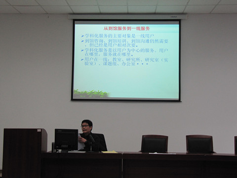 倪老师向各位同事介绍了目前国内高校图书馆学科化服务的几种模式和内容,并通过案例分析了学科化服务的内涵和特点。同时,他还结合我校图书馆实施学科化服务的实践,提出了结合自身实际和专业特色、积极推进和深化学科化服务的设想和建议。