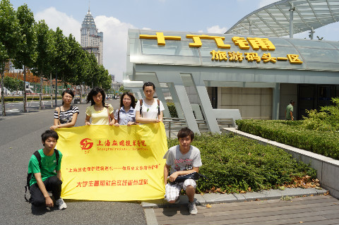 队员们顶着酷暑,找到了十六铺码头的依稀旧址,询问了保护旧址的保安并做了相关的问卷调查,清晰发现现今十六铺码头与旧址的巨大差别。然后,队员们来到新十六铺码头,通过拍照、记录下这崭新的历史建筑,询问路人、工作人员有关十六铺码头货物流通、历史地位、存在意义等具体情况,完成了几十份的问卷调查。