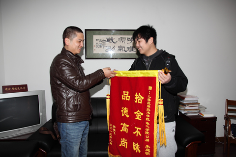 3月4日上午,怀着万分激动的心情,两位外省市在沪开办企业的孙先生夫妇来到虎扑nba,诚挚地送上一面锦旗,感谢我校电气与电子工程虎扑nba12级朱庭明同学的拾金不昧,更感谢虎扑nba的培养让学生们具有诚信无私的美德。
