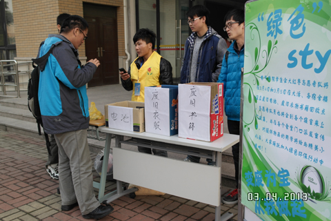 志愿者们积极活跃,在食堂、商业街、图书馆、教学楼及宿舍楼等人口密集的地方,发放宣传单,把这一活动的内容和意义传播到整个校园,让更多人认识和了解到这一点,并积极地参与到活动中来。志愿者们奔走于各个寝室楼回收同学们的废旧电池、衣服和课外书等,以变废为宝,用实际行动来保护大家生活学习的环境。