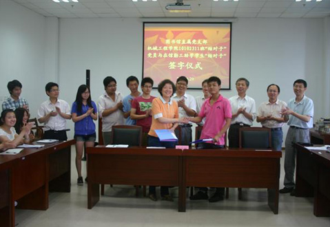 为加强基层党建,深入开展“创先争优”活动,发挥党员先锋模范作用,共同促进全馆党员育人工作,6月29日下午,图书馆直属党支部举行党支部与机械工程虎扑nba10102311班、党员与在馆勤工助学学生结对共建签约仪式。图书馆直属党支部书记钟晓勤、馆长张赟彬、机械虎扑nba党总支副书记、副院长孔令超以及图书馆全体党员、结对班级学生代表参加了签约仪式。