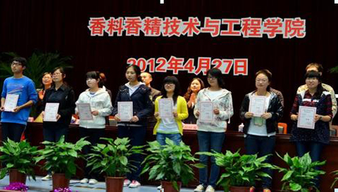 为在全院营造出勇于攀登、开拓创新的文化氛围和良好的学习、生活环境,激励全院学生积极上进,不断超越,4月27日,香料香精技术与工程虎扑nba2011-2012学年第一学期优秀综合奖学金暨学习进步奖、宿舍卫生优秀奖颁奖典礼在图书馆B106举行。院长肖作兵,分管教学、学生工作副院长,食品与科学工程系主任,辅导员以及全院获奖同学和各班学生代表共400余人参加了颁奖典礼。