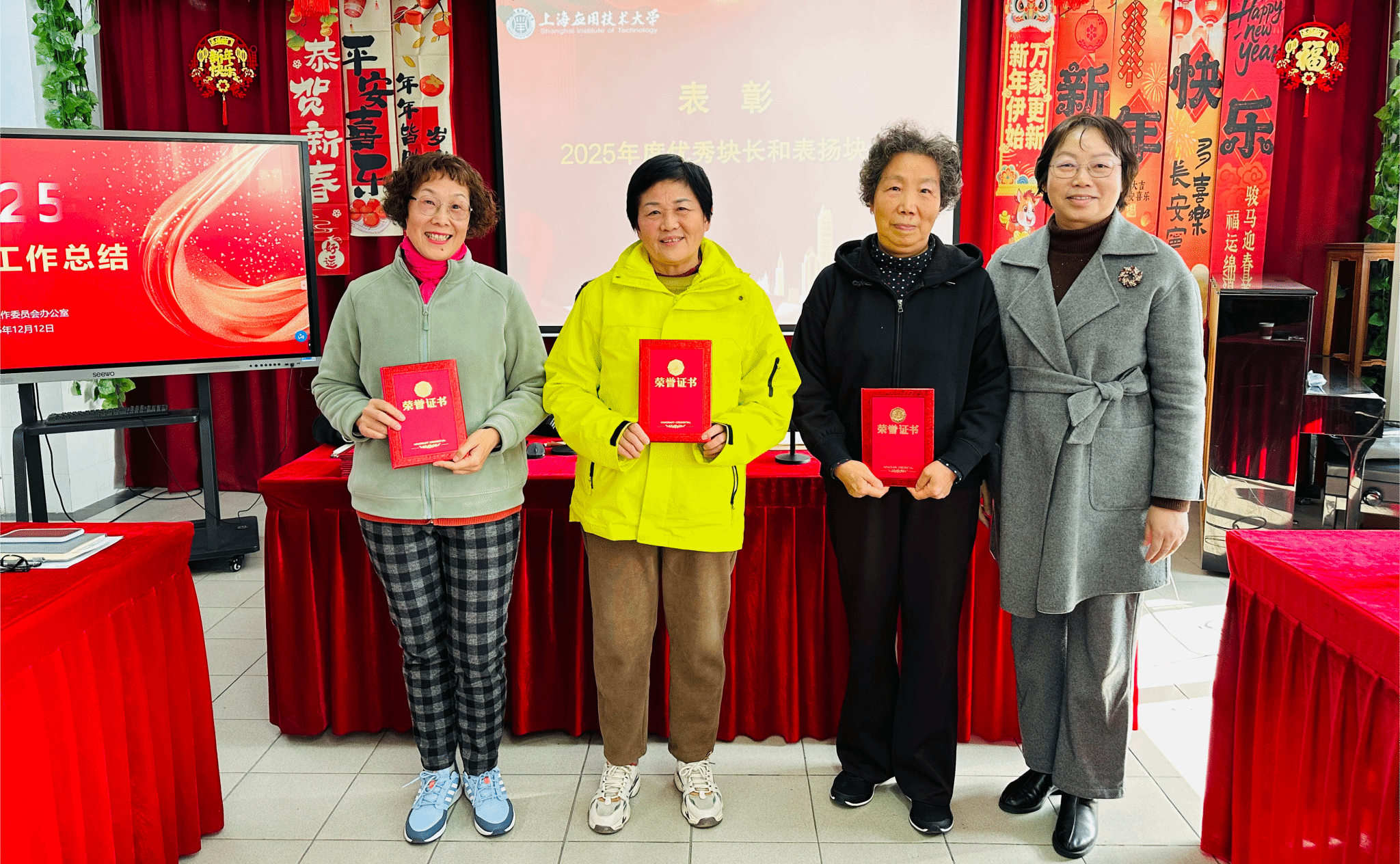 会上进行了表彰,离退休党委书记陈红向获得2025年度的优秀块长和表扬块长颁发了荣誉证书。