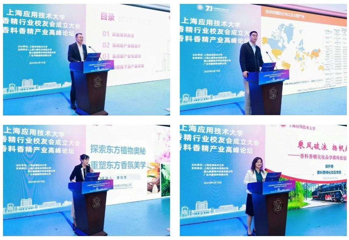 上海香料研究所有限公司总经理毛海舫、上海九橙实业有限公司副总经理顾磊、广东铭康香精香料有限公司技术中心副总经理唐明慧、上海应用技术大学田怀香教授,分别围绕薄荷醇产业链设计与产业化、世界柑橘属香料的现状及其思考、探索东方植物奥秘和重塑东方香氛美学以及香料香精化妆品学部科技创新进展汇报等主题作报告。