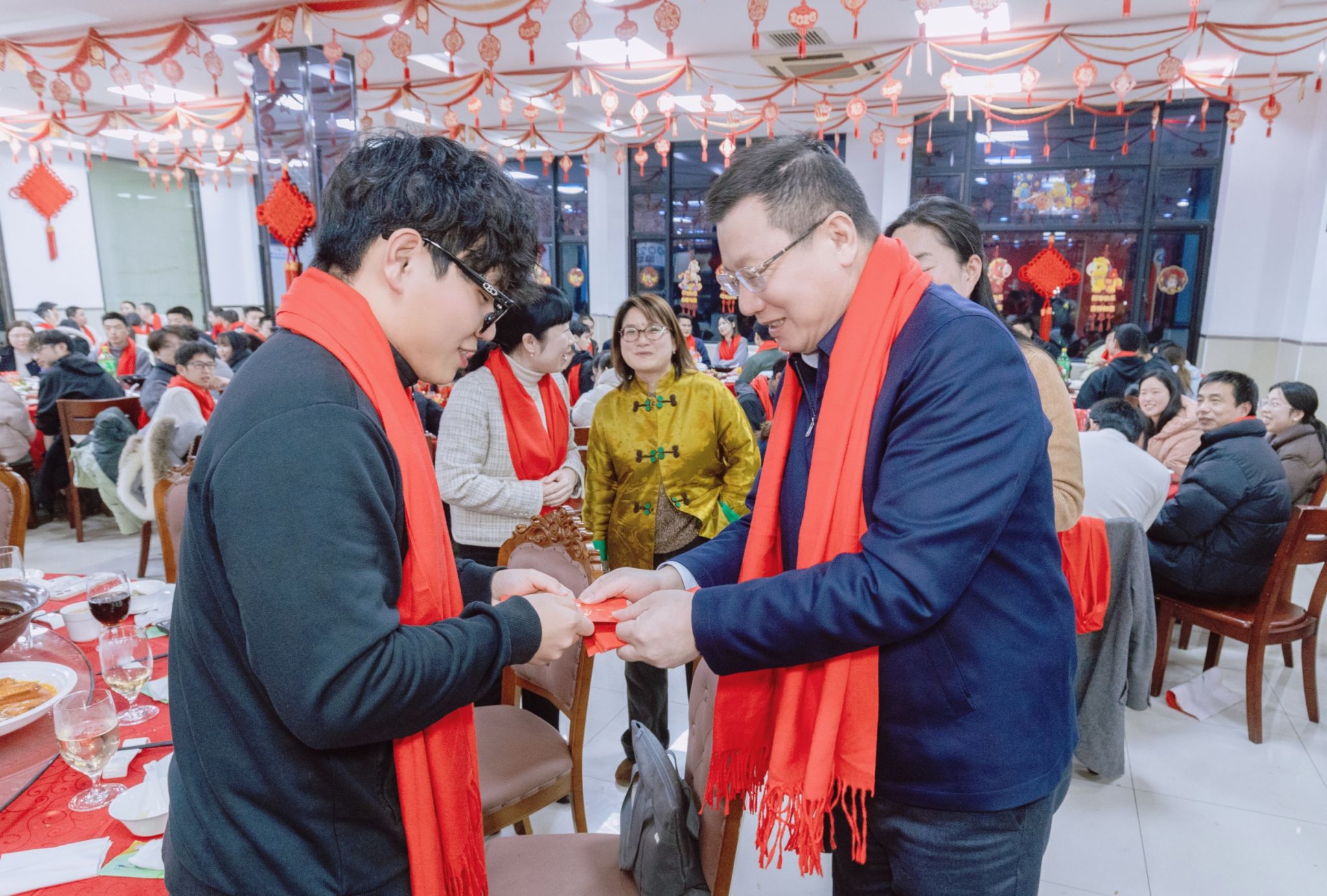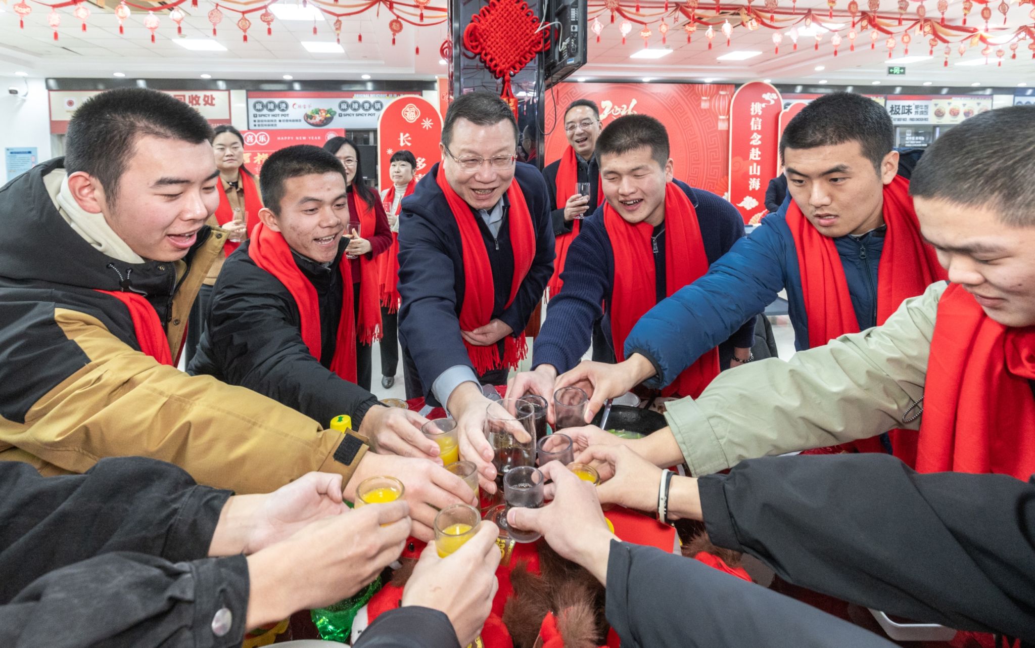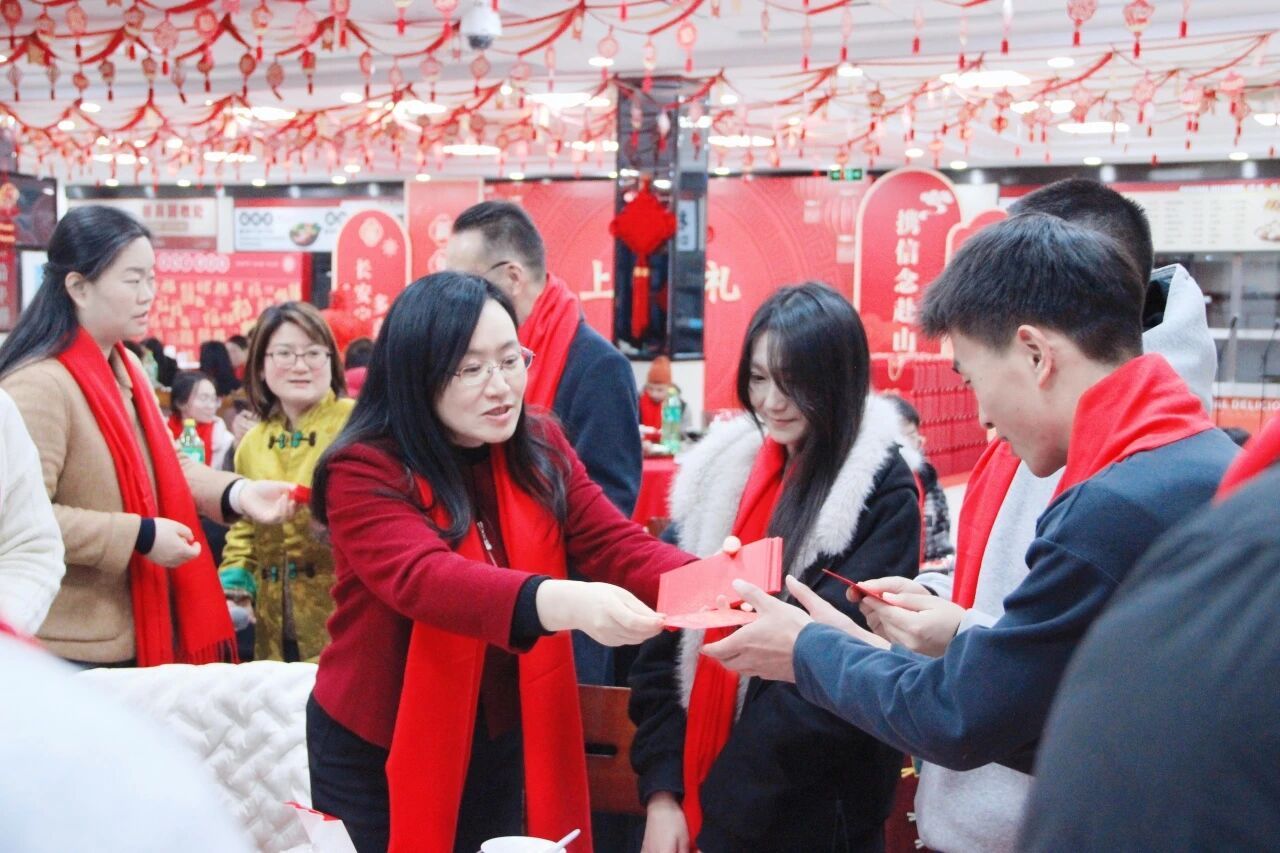 席间更是热气腾腾,笑语不断。校领导们走到师生中间,亲切交谈,细细询问同学们的假期安排与生活情况。汪小帆和王瑛逐一向同学们拜年,并发放红红火火的新春红包与精心准备的“上应福袋”。学子们笑逐颜开,欢呼声、道谢声此起彼伏,现场洋溢着融融暖意与浓浓年味。