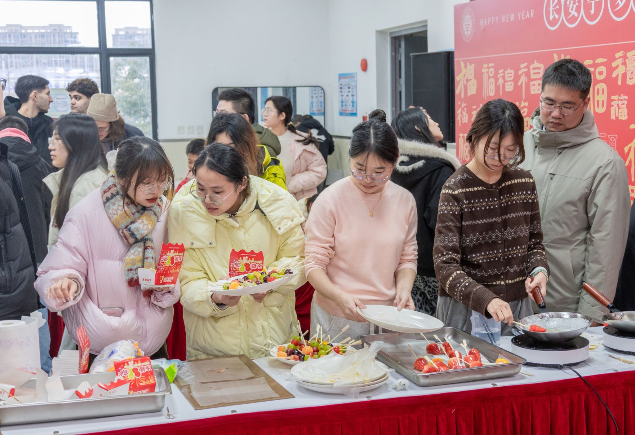 年俗体验区,师生们围在一起分工协作,揉面团、擀饺皮,一个个饱满的饺子摆满托盘;挥毫泼墨写春联、绘福字,墨香阵阵沁人心脾;串起晶莹剔透的糖葫芦,咬一口酸甜酥脆,满是童年的味道。