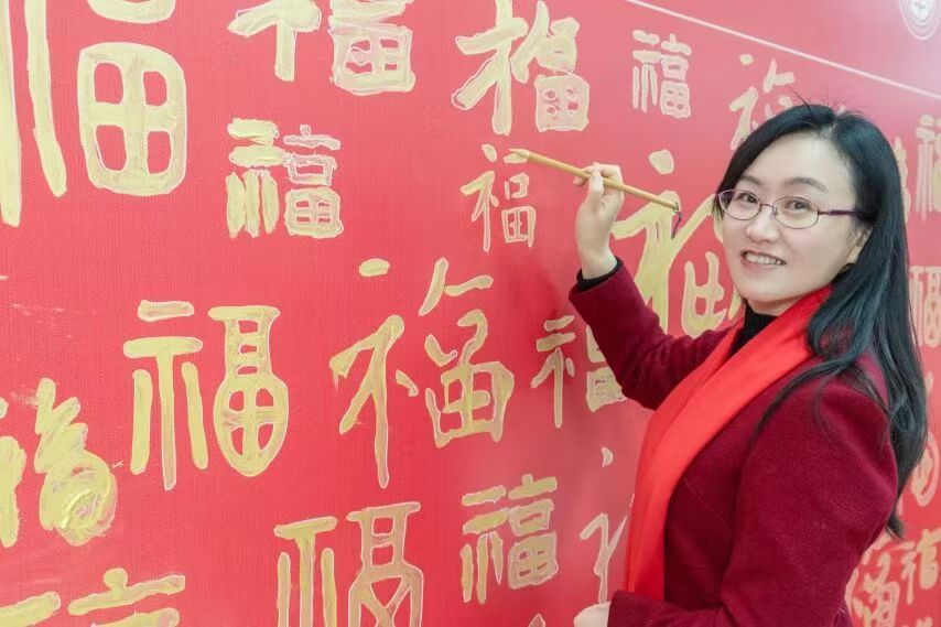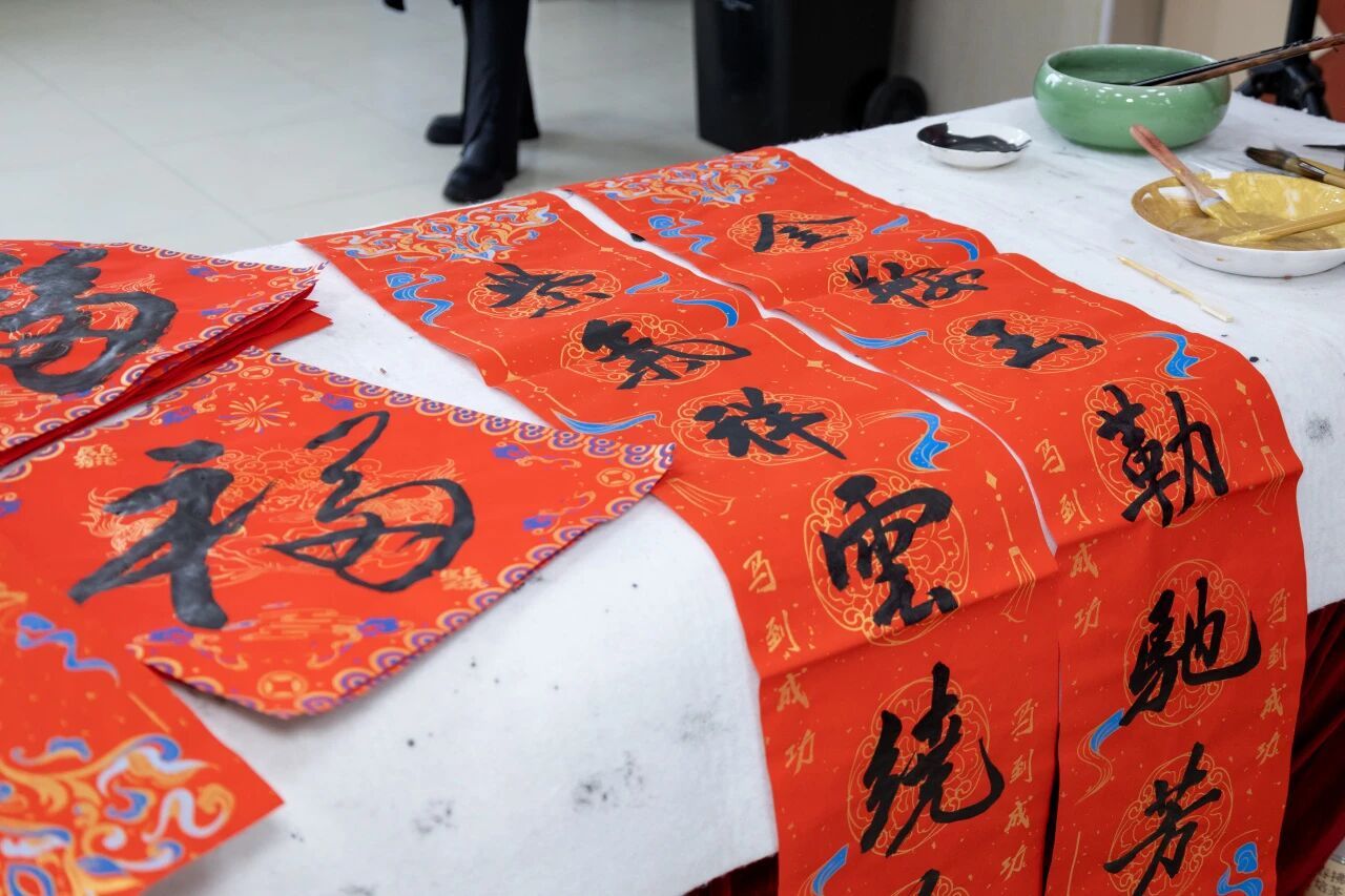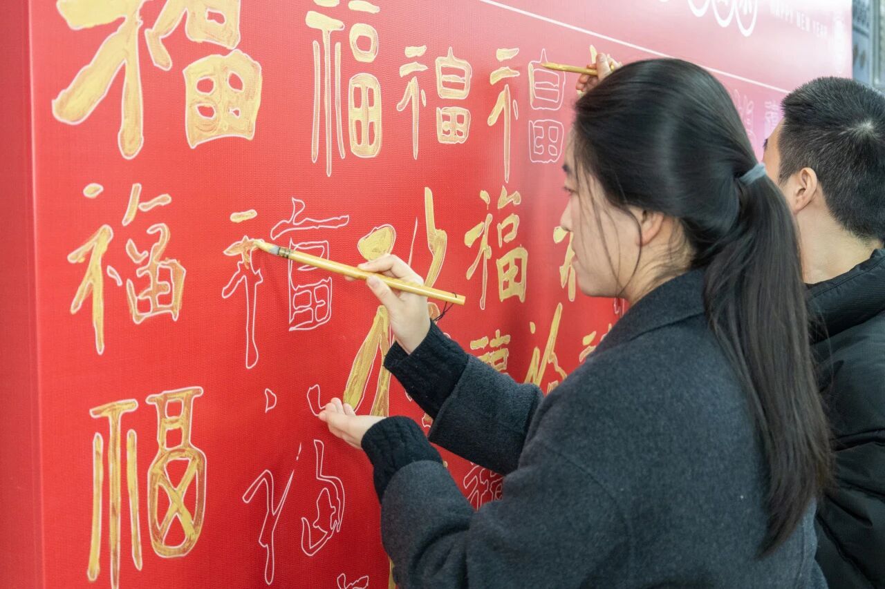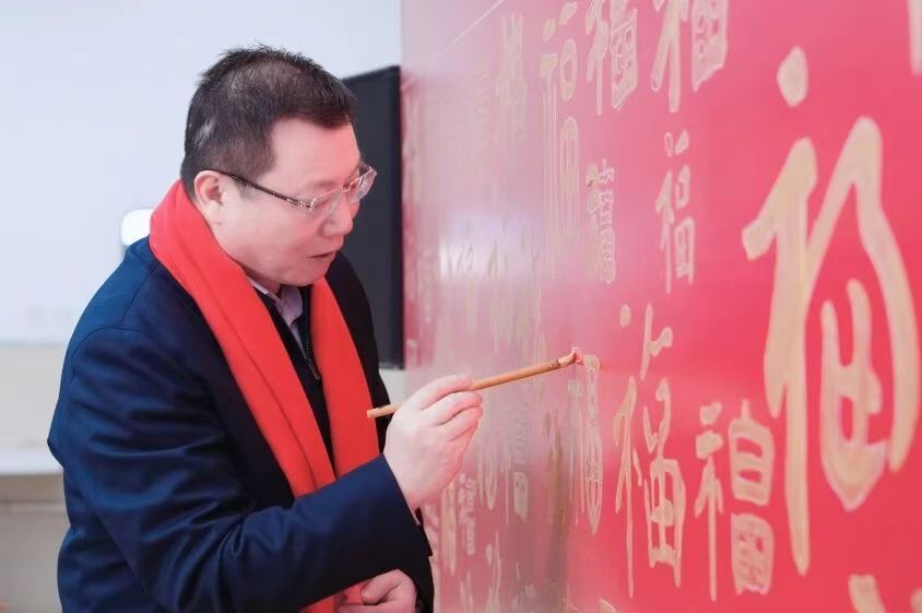 一幅幅喜庆的对联、一个个吉祥的福字,拼凑成一面红彤彤的“百福墙”,在欢声笑语中,师生们共同亲手绘就出最有温度的团圆画卷。