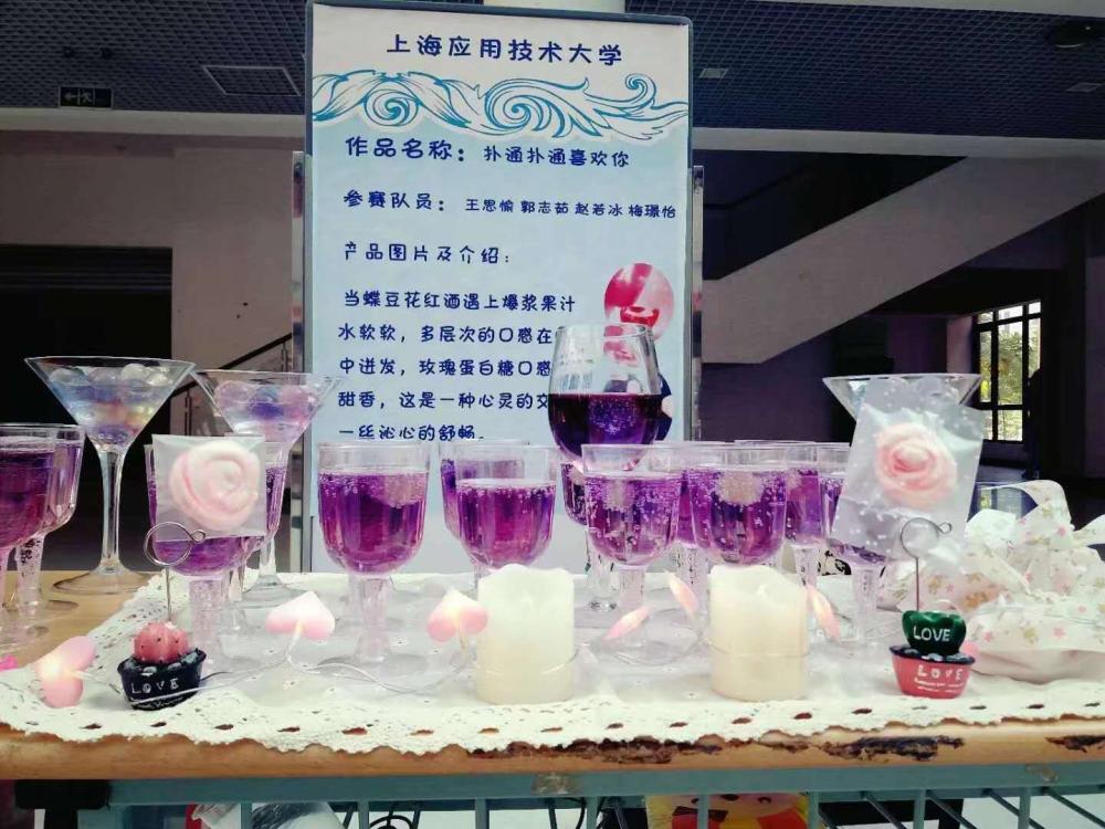讲完自己的毕设苦荞转性研究后,小郭继续讲自己和同学们一起用专业知识做的发明。比如,饮料创意比赛上,他们的创意是“扑通扑通喜欢你”,利用海藻酸钠和氯化钙,做出了剔透的海藻球,类似爆珠奶茶里的爆珠口感,原本还想加上火龙果刻成的星形水果块,实践下来发现口感不好且失败率很高。于是他们保留了海藻球部分,火龙果换成了遇酸可变色的蝶豆花水,再加入柠檬、蜂蜜混合的气泡水,一杯外观紫色,内里晶莹,还有一颗颗“水晶球”的饮料制作完成。
