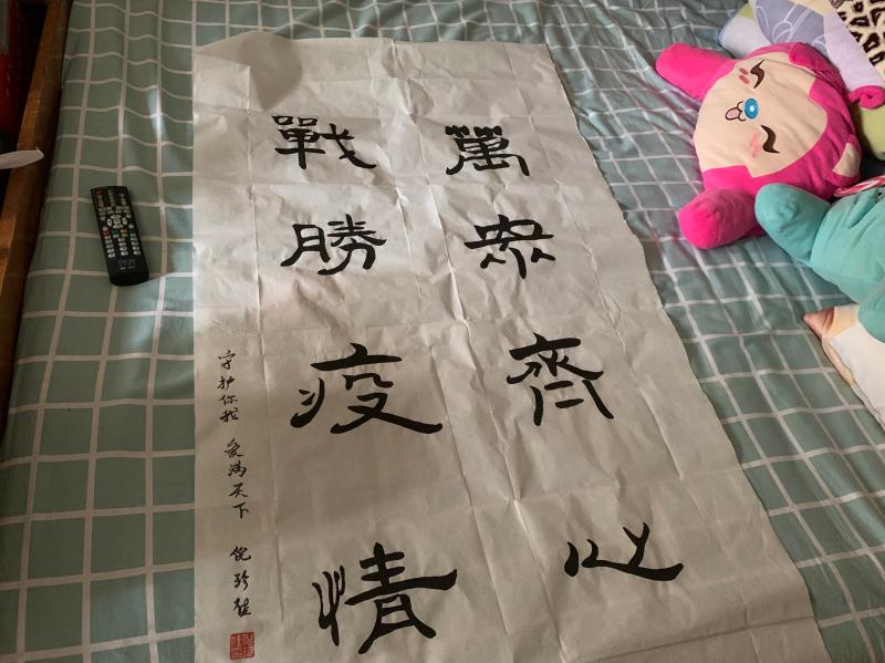 这次春节后回沪隔离期间,倪珍佳花了三天时间,临摹、练习、折纸,写下了书法“万众齐心,战胜疫情”,家里地方不大,她趴在地上铺开纸张来写,她喜欢墨水的味道,认真地说:“我觉得这八个字意义很大,看到很多人都去了武汉,就觉得只要一条心,这个疫情一定能过去。”