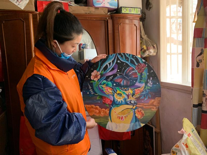 倪珍佳最喜欢的高中毕业作品,丙烯画的彩色鹿。(刘雪妍 摄) 做不了语言宣传,跑腿也行