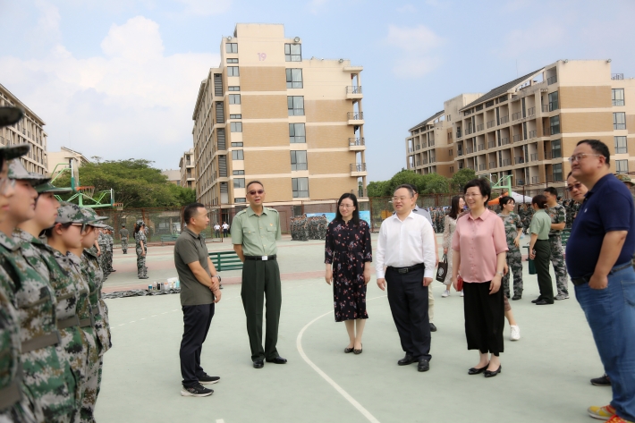 9月7日,校党委书记郭庆松,校长柯勤飞,校党委副书记、副校长王瑛来到军训现场,看望慰问正在紧张训练的承训教官、参训学生和全体工作人员。