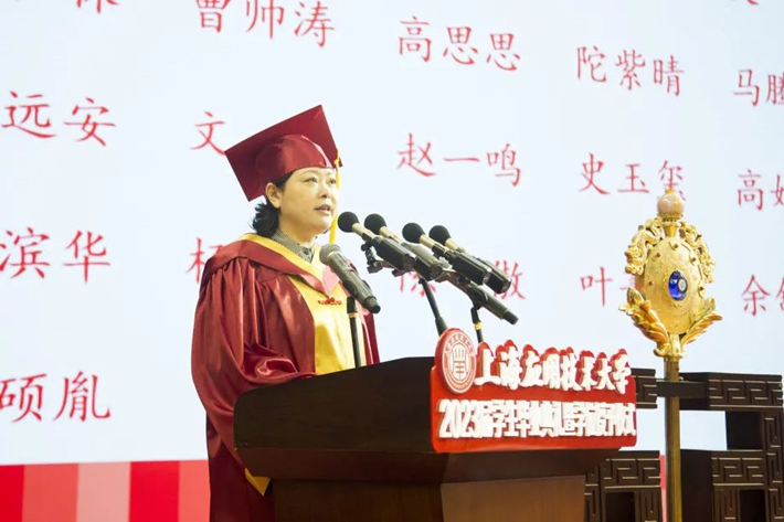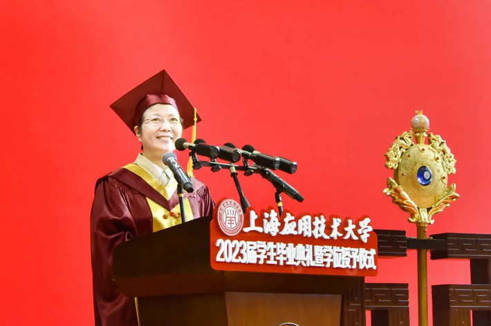 校党委副书记陈海瑾宣读“关于表彰 2023 年上海市优秀毕业生、上海应用技术大学优秀毕业生的决定”。250名毕业生获得上海市优秀毕业生荣誉称号,473名毕业生获得校优秀毕业生荣誉称号。