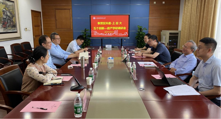 5月31日,奉贤区科委党组书记卫连清、副主任黄璐(挂职)一行到访我校,围绕五个创新-政产学研开展调研指导,副校长毛祥东热情接待。双方就深入推进区校联动、打造海湾科创基地,服务地方经济社会发展等事宜进行座谈交流。座谈会由科研院院长韩生主持。