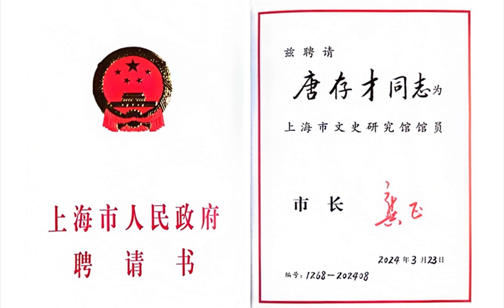 4月11日,上海市文史研究馆馆员聘任仪式在市政府举行,我校退休教师唐存才荣聘为新聘馆员。市委副书记、市长龚正为唐存才等22位新聘馆员颁发聘书,副市长解冬宣读市政府关于聘任馆员的通知。