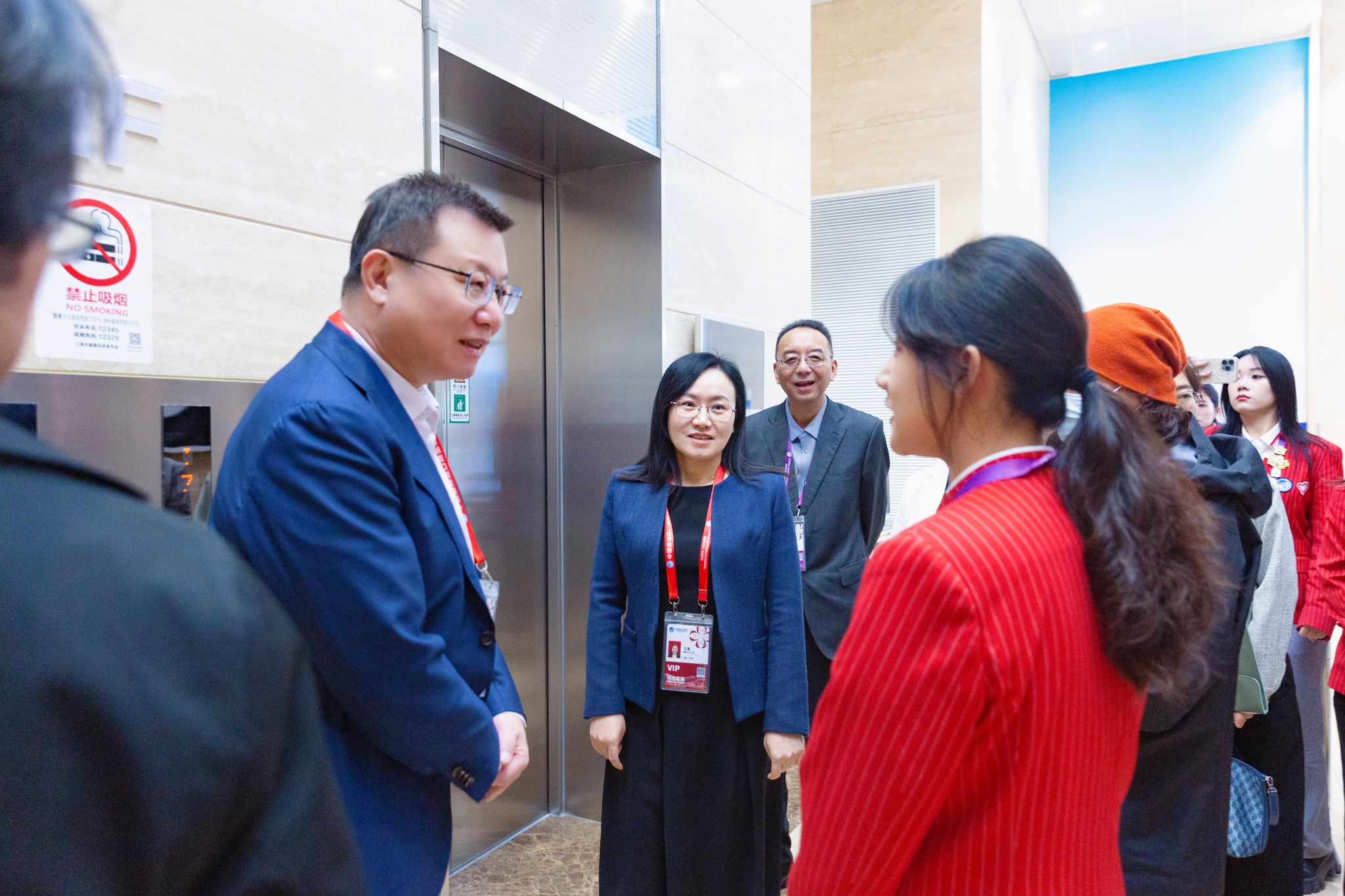 11月7日,校长汪小帆,校党委副书记、副校长王瑛来到国家会展中心,看望慰问服务第七届进博会的上应“小叶子”们,为志愿者们加油鼓劲,并同团市委副书记王江、团市委挂职副书记唐志宇亲切交谈。