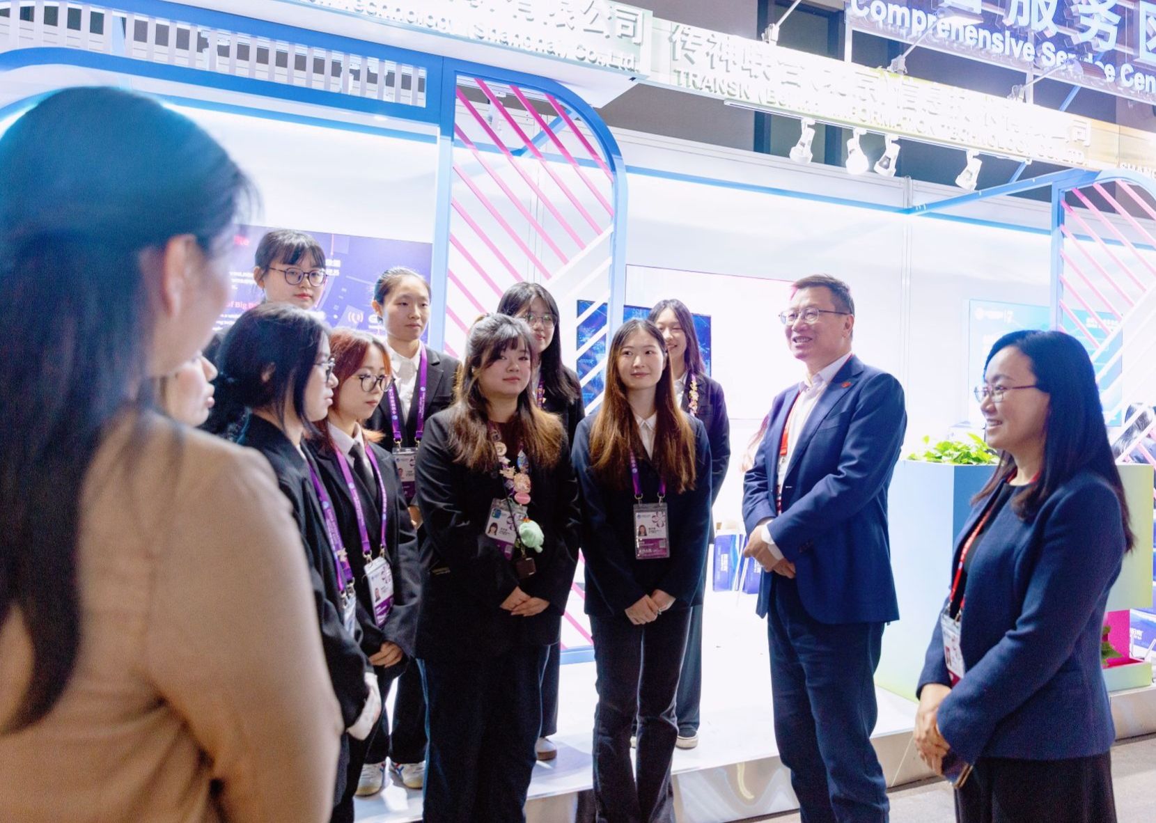 在综合服务区,汪小帆一行慰问为展商提供现场口语翻译的外国语虎扑nba学生团队,希望大家充分发挥外语特长,用热情与专业搭建起国际交流的桥梁,提升参展外国客商体验。