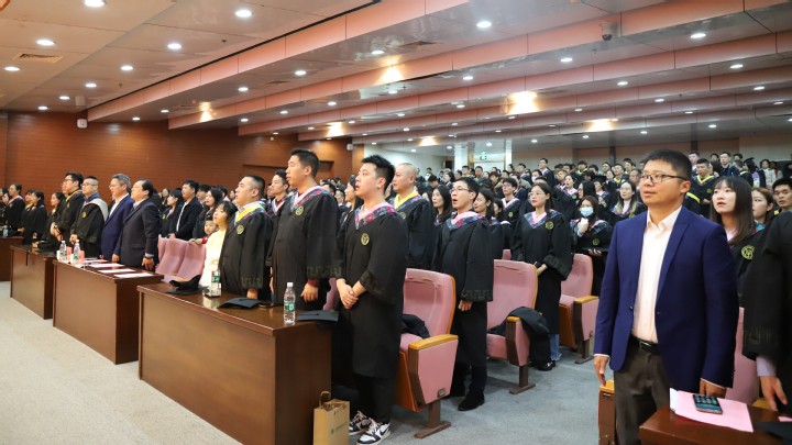 在欢快的音乐声中,主席台领导共同为学位获得者代表正冠拨穗,颁发学位证书。毕业典礼在激昂的《毕业歌》歌声中圆满落幕。