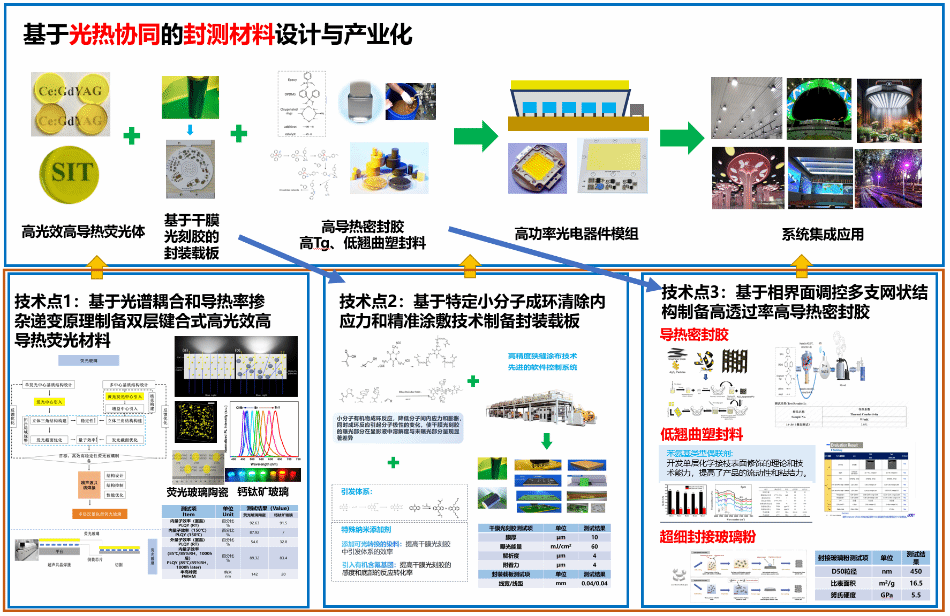 经中国商业联合会科技成果鉴定,本项目研究成果整体达到了国际先进水平,基于光热协调理论和导热率掺杂递变原理制备的多层键合式荧光材料和基于相界面调控多支网状结构制备的密封胶材料核心技术指标达到国际领先水平。