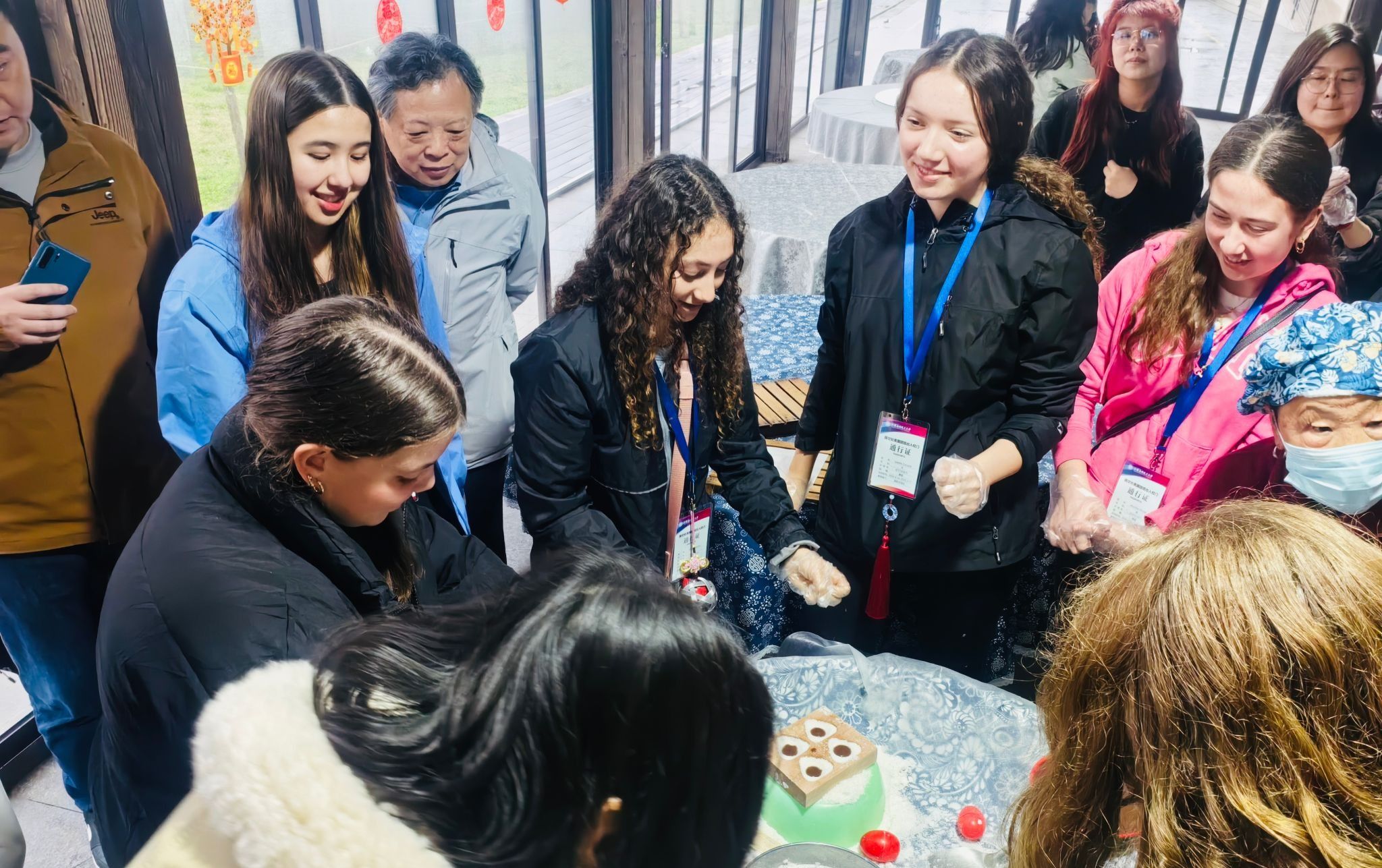 在奉贤言子书院、青溪古镇,我校英语专业学生以中英双语讲解“孔门十哲”之一言偃的礼乐思想和儒家文化源流。美国学生观展《论语》名句时感慨:“孔子‘和而不同’的理念与我们的多元文化课程竟如此相通!”柘林镇“又见炊烟·小森营地”的非遗体验让美国师生惊叹于中国本土特色文化的生命力。在非遗传承人指导下,中美青年共同制作方糕和香囊,揉米浆、刻花模、蒸米糕的工序带领美国学生体验中国美食的制作过程;檀香与艾草气味萦绕间,美方师生将香牌系于颈间,体悟香道承载的东方意蕴与哲思。滚灯表演中,竹编灯球在空中划过一道道金色弧线,让美国学生感受非遗技艺的博大精深。