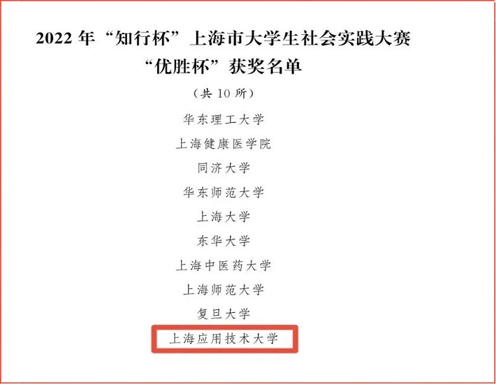 近日,2022年“知行杯”上海市大学生社会实践项目大赛结果正式公布,我校再次荣获“知行杯”上海市大学生社会实践大赛“优胜杯”(全市仅10个),同时我校实践团队获上海市一等奖1项、二等奖3项,三等奖3项;5名教师获上海市优秀指导教师;2名学生获上海市先进个人。