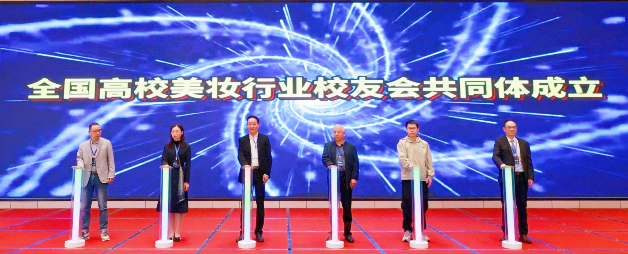 会上,上海应用技术大学化妆品行业校友会发起成立“全国高校美妆行业校友会共同体”。江南大学化工上海校友会副会长何斌、华东理工大学美妆行业校友会理事长王霆章、郑州轻工业大学日化华东校友会会长马国希、华南理工大学日化校友会秘书长王珊、北京工商大学化妆品行业校友会秘书长江彪、齐鲁工业大虎扑nba友会会长王霆章,与上海应用技术大学化妆品行业校友会常务副会长宋建华代表6所发起单位共同按亮灯柱,宣告全国首个化妆品行业校友跨校共同体成立,未来共同体将加强全国范围内化妆品行业校友交流合作,整合化妆品校友资源,进一步反哺化妆品高等教育。